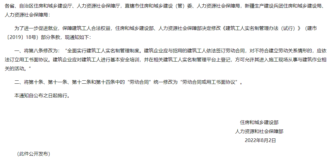 住房和城鄉(xiāng)建設部 人力資源社會保障部 關于修改《建筑工人實名制管理 辦法(試行)》的通知